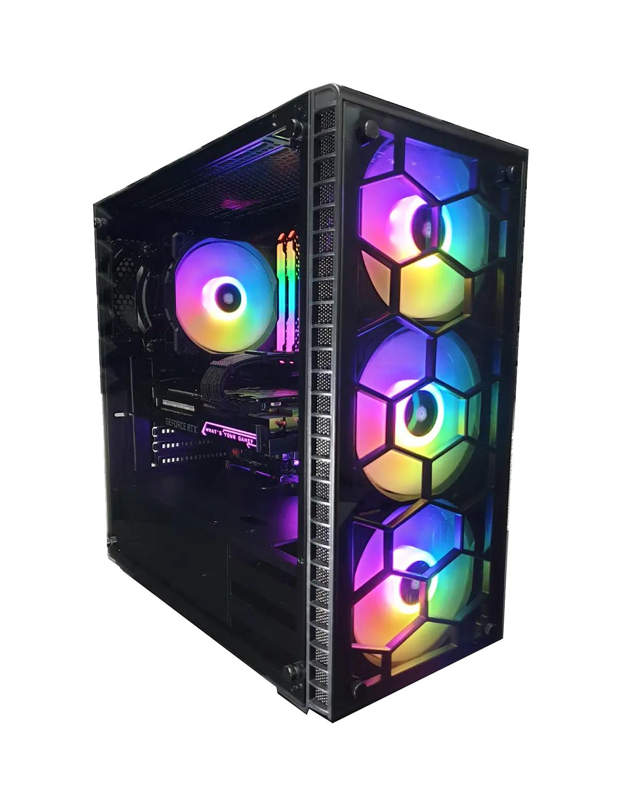 Chassit i svart A-RGB design med fyra RGB-fläktar och Cooler Master RGB vattenkylning ger både stil och effektiv kylning. Den snabba 2TB NV3 Gen 4 SSD:n säkerställer ultrasnabba laddningstider och perfekt respons. Med Windows 11 Pro installerat är allt redo direkt vid uppstart.